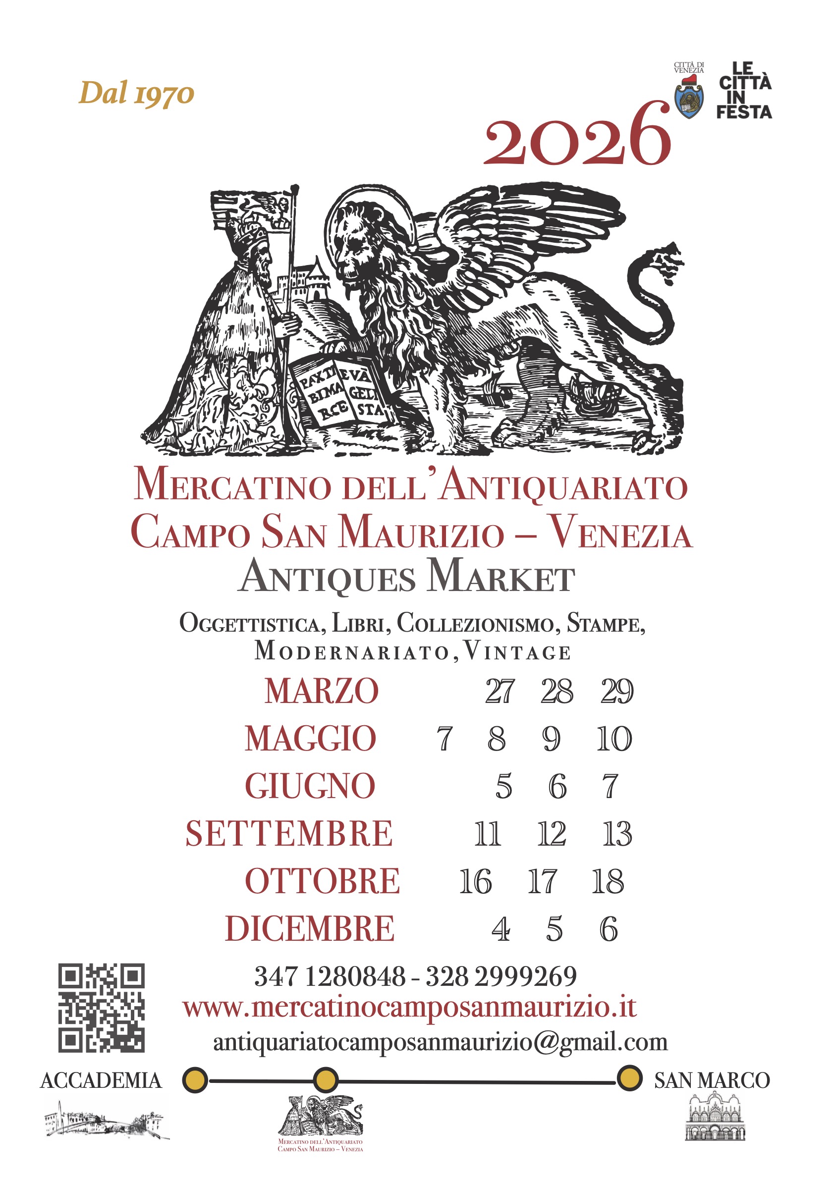 Se si capita a Venezia durante uno dei fine settimana in cui si svolge lo storico mercatino dell’antiquariato di campo San Maurizio, una visita è d’obbligo. La nostra associazione porta a Venezia per questo evento operatori professionali da tutta l’Italia e le loro preziose merci, oggetti e curiosità del passato ma soprattutto pezzi pregiati dal ‘600 al ‘900, esposte sui tipici moduli in legno che la tradizione vuole invariati dal 1970 anno di fondazione del mercato, possono soddisfare i collezionisti più esigenti. Le manifestazioni avranno luogo sempre con orario 9 – 19.